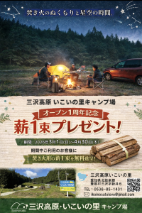 いこいの里キャンプ場のオープン1周年を記念して、2026年3月1日から4月30日の間にご利用されるお客様に、焚き火用の薪を1束プレゼントさせていただきます! 焚き火のぬくもりと星空の時間を楽しみに遊びに来てください。